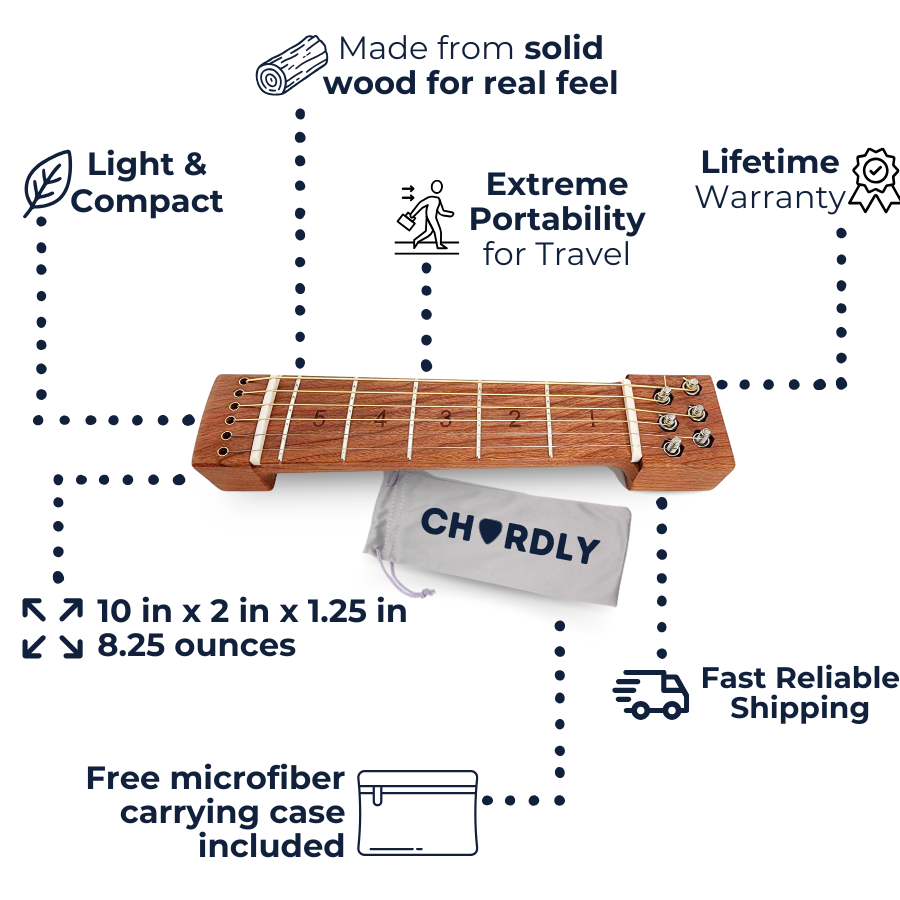 Every Chordly unit is built to last and comes with a lifetime warranty covering the wood body, metal hardware, and core mechanical components. If anything ever goes wrong, we’ll send replacement parts or handle the repair ourselves. Normal wear, such as string replacement, isn’t covered, but you can use any of your favorite guitar strings or purchase replacements directly from us.